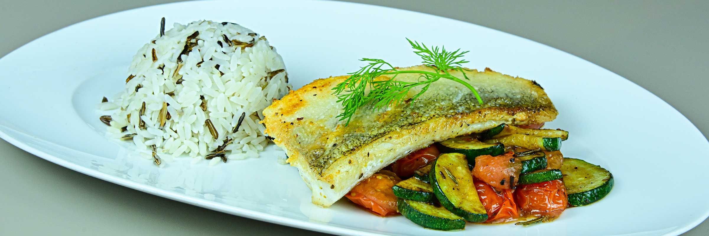 mit Tomaten-Zucchini-Gemüse, Basmatireis und einer Limonenbutter
