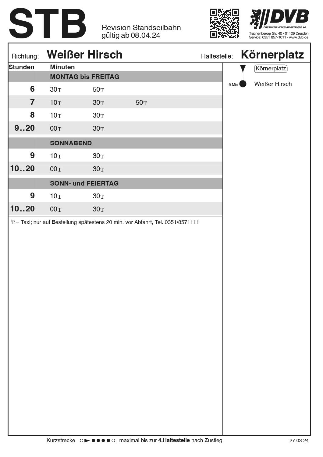 Ruftaxi (Körnerplatz ⇔ Weißer Hirsch), nach telefonischer Bestellung spätestens 20 min. vor Abfahrt unter 0351 8571111.
